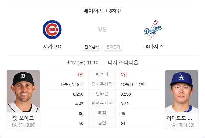 | 4월 12일 MLB 메이저리그 콜로라도 로키스 VS 샌디에이고 파드리스 타카짱의 경기 예측 분석 (0) | 2025.04.12 |