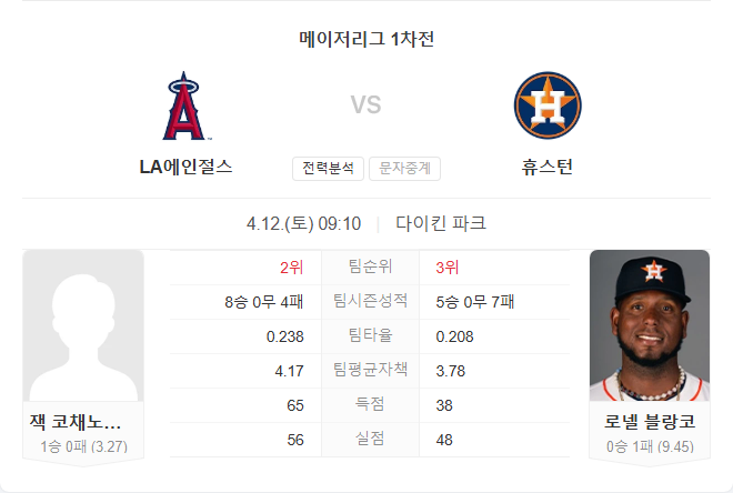 에인절스는 타선과 선발에서 모두 안정적인 흐름을 보여주고 있으며, 최근 경기력에서는 휴스턴보다 우세합니다. 코차노위츠는 시즌 첫 경기에서 인상적인 피칭을 보여주었고, 마이크 트라웃과 오호피를 중심으로 타선의 응집력도 강합니다.
