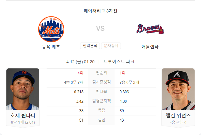 루이스 세베리노와 맥스 프리드 모두 시즌 초반에 어려움을 겪고 있지만, 메츠와 브레이브스 모두 강력한 타선을 보유하고 있어 경기는 치열할 것으로 예상됩니다.