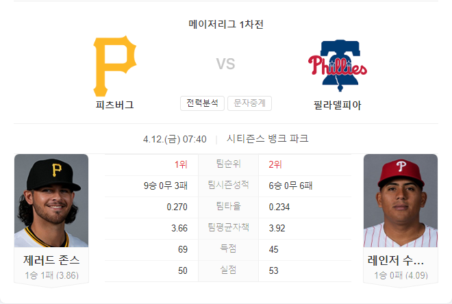 피츠버그 파이어리츠는 올 시즌 초반 강력한 타선과 안정된 투수진을 바탕으로 좋은 성적을 거두고 있습니다. 반면, 필라델피아 필리스는 아직까지 일관된 경기력을 보여주지 못하고 있는 상황입니다.