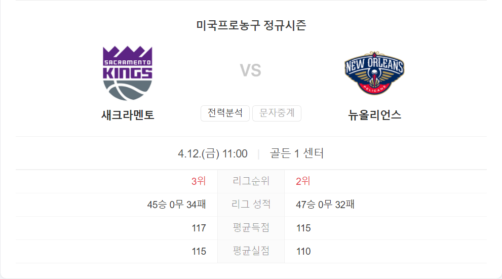 세크라멘토 킹스는 아직 플레이인 토너먼트 진출이 확정되지 않았으며, 남은 세 경기에서 승리하여 6위로 올라서고자 합니다. 하지만, 이번 시즌 펠리컨즈를 상대로 4번의 맞대결에서 모두 패하며 어려움을 겪고 있습니다. 최근 오클라호마시티 썬더와의 경기에서 패하며 5.5점의 핸디캡을 극복하지 못했습니다.