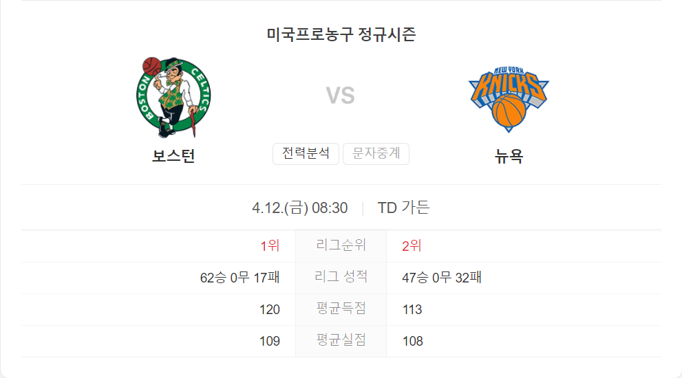 4월 12일 NBA 뉴욕 닉스 VS 보스턴 셀틱스 타카짱의 경기 예측 분석