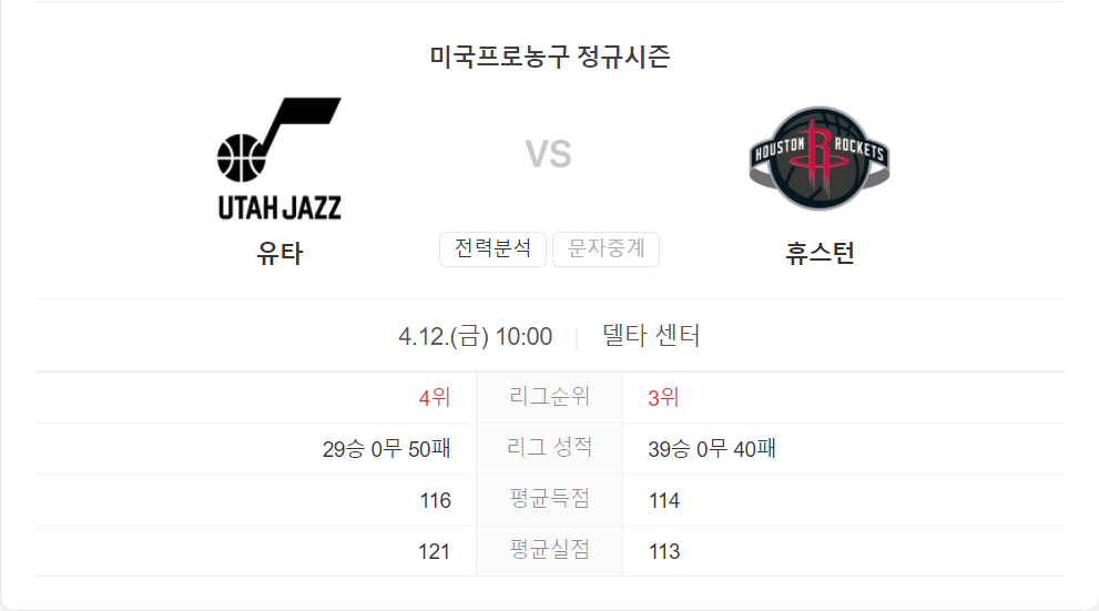 4월 12일 NBA 휴스턴 로케츠 VS 유타 재즈 타카짱의 경기 예측 분석