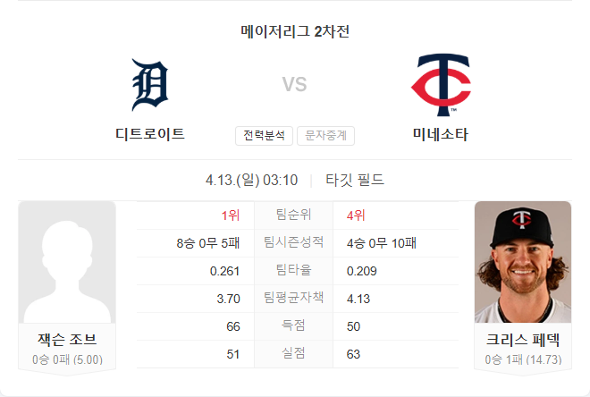 이번 경기에서는 양 팀 모두 선발 투수의 안정감이 부족한 가운데, 최근 팀 흐름과 타격 생산력에서 디트로이트가 명확한 우위를 점하고 있습니다. 잭슨 조브는 신예로 불안 요소가 있지만, 미네소타 타선의 극심한 부진을 고려하면 무난한 피칭이 가능할 전망입니다.