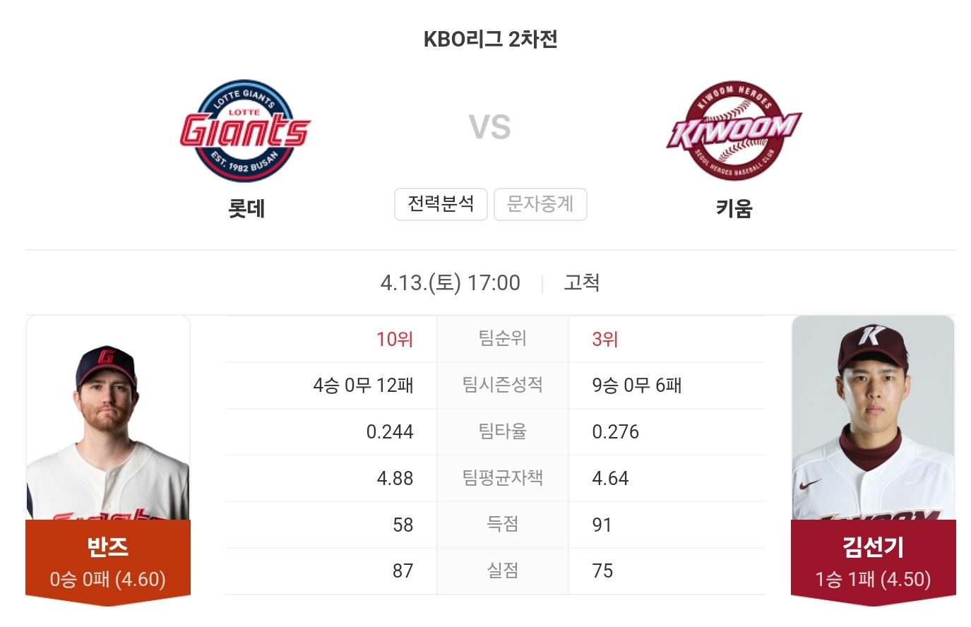 키움 히어로즈는 연승 흐름을 이어가기 위해 김선기를 다시 마운드에 올립니다. 김선기는 이번 시즌 꾸준한 성적을 유지하며 팀의 중심 투수로 자리매김하고 있습니다.