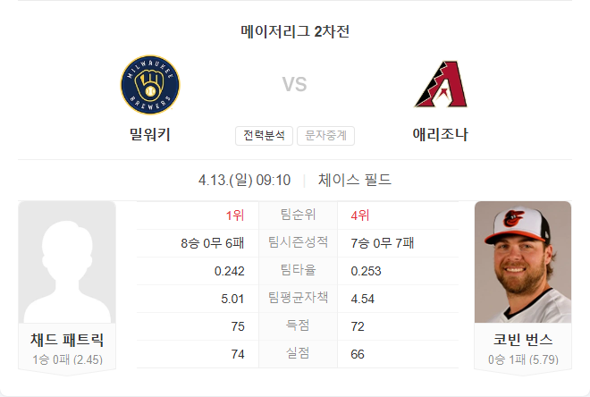 이날 선발로 나서는 코빈 번스는 시즌 2경기에서 0승 1패, 평균자책점 5.79로 다소 부진한 출발을 보이고 있습니다. 직전 워싱턴전에서는 5이닝 4실점으로 패전 투수가 되었으며, 제구 난조로 4개의 볼넷을 허용했습니다. 번스는 밀워키를 상대로는 1차례 등판 경험이 있으며, 체이스 필드에서는 2경기에서 1승 무패, 평균자책점 3.29를 기록하고 있습니다.