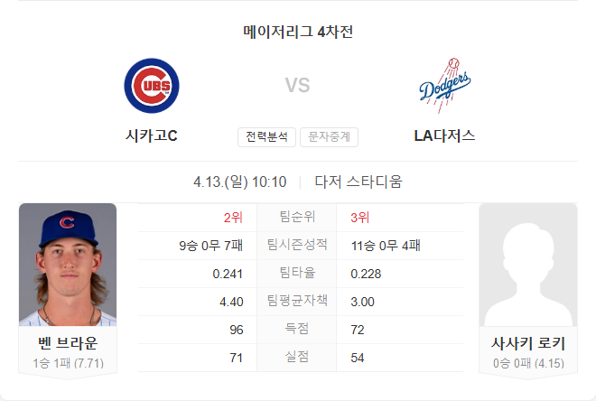 이번 경기는 강한 공격력을 자랑하는 두 팀이 만나는 매치업으로, 타격전 양상이 예상됩니다. 컵스는 도루와 장타력을 바탕으로 다저스 마운드를 공략할 수 있지만, 선발과 불펜 모두 불안정한 점은 리스크입니다.
