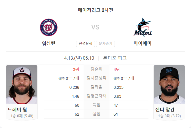 양 팀 모두 상승 흐름을 타기 위해 중요한 일전을 치르게 됩니다. 워싱턴은 타선의 집중력과 장타력을 앞세워 득점을 노리겠지만, 마이애미는 홈 이점을 바탕으로 안정적인 선발 샌디 알칸타라의 피칭을 통해 경기 주도권을 가져올 가능성이 큽니다.