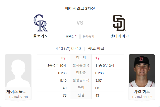 4월 13일 MLB 메이저리그 콜로라도 로키스 VS 샌디에이고 파드리스 타카짱의 경기 예측 분석