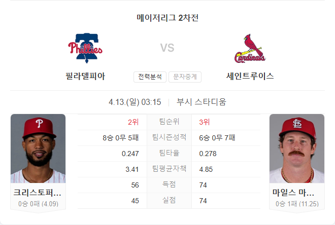 이번 경기는 타선에서는 세인트루이스가 우세하지만, 마운드에서는 필라델피아가 확실한 우위를 점하고 있습니다. 특히 마이콜라스가 올 시즌 초반 극심한 난조를 보이고 있어, 필라델피아의 상위 타선이 그를 공략할 가능성이 높습니다.