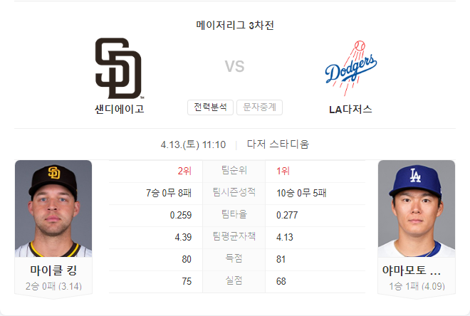 4월 13일 MLB 믈브 샌디에이고 파드리스 VS LA 다저스 타카짱의 경기 예측 분석
