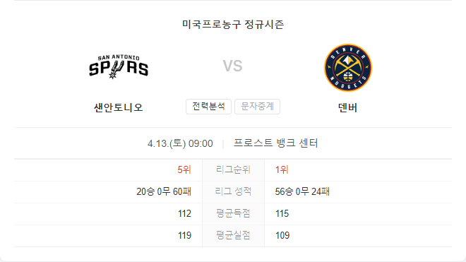 이번 경기에서는 현재 포스트시즌 준비에 박차를 가하고 있는 덴버 너겟츠와 여러 주요 선수의 결장으로 어려움을 겪고 있는 샌안토니오 스퍼스가 맞붙습니다. 덴버는 요키치를 중심으로 안정적인 공격 라인을 구축하고 있으며, 특히 홈코트 이점을 활용해 서부 컨퍼런스 1위를 확보하기 위해 모든 역량을 집중할 것입니다.