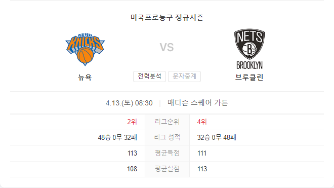 이번 브루클린 네츠와 뉴욕 닉스의 경기는 두 팀 간의 오랜 라이벌 관계를 감안할 때 많은 관심을 끌고 있습니다. 뉴욕 닉스는 홈에서 강한 모습을 보여주고 있고, 최근 경기에서도 좋은 성적을 거두고 있어 이번 경기에서도 우위를 점할 것으로 보입니다. 반면, 브루클린 네츠는 일관성 없는 경기력과 부상 문제로 인해 어려움을 겪고 있습니다.