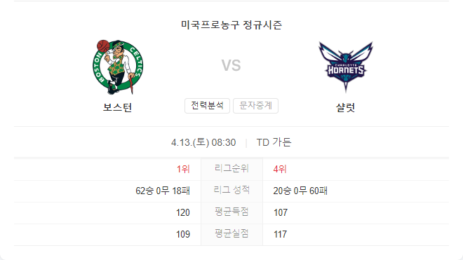 이 경기는 셀틱스가 높은 순위를 확보하고 있고 호넷츠가 시즌을 마무리하면서 큰 의미가 없는 경기가 될 수 있습니다. 그러나 보스턴은 플레이오프 진출을 앞두고 있는 상황에서 패배의 연속을 원치 않을 것입니다. 보스턴은 이 경기에서 승리하여 긍정적인 분위기를 유지하려 할 것입니다.