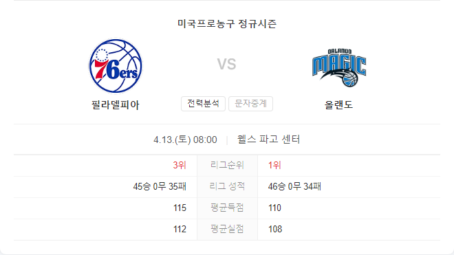 4월 13일 NBA 올랜도 매직 VS 필라델피아 세븐티식서스 타카짱의 경기 예측 분석