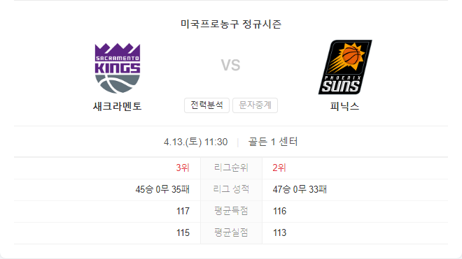 이번 경기는 피닉스 선즈와 세크라멘토 킹스가 서로 맞붙게 되는데, 양 팀 모두 플레이오프 진출을 위해 중요한 승점이 걸린 경기입니다. 피닉스 선즈는 최근 경기에서 좋은 수비력을 보여주고 있으며, 세크라멘토 킹스 역시 홈에서 강한 모습을 보여왔습니다.