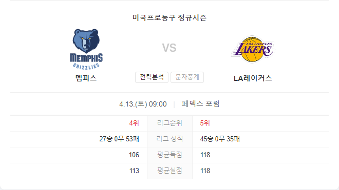 이번 LA 레이커스와 멤피스 그리즐리스의 경기는 두 팀의 상반된 상황에서 치러집니다. 레이커스는 플레이인 토너먼트에서 좋은 성적을 거두기 위해 승리가 필요한 반면, 그리즐리스는 시즌을 마무리하면서 젊은 선수들에게 경험을 쌓게 할 것입니다.