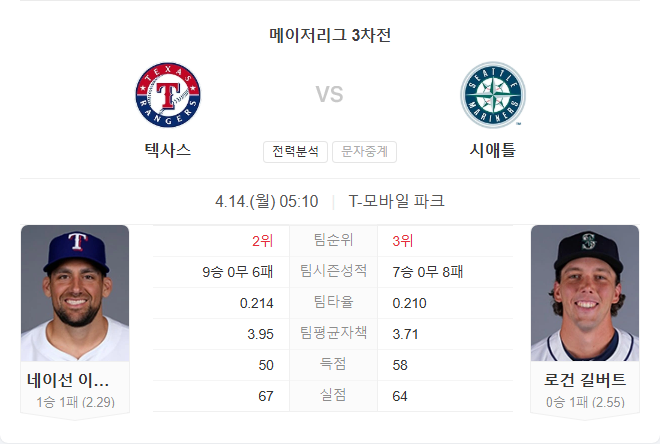 레인저스는 최근 타선의 부진과 불펜의 불안정으로 인해 어려운 경기를 펼치고 있습니다. 반면, 매리너스는 길버트의 안정적인 투구와 홈에서의 강한 모습을 바탕으로 경기를 유리하게 이끌 것으로 예상됩니다. 특히, 길버트는 텍사스를 상대로 강한 성적을 보이고 있어, 매리너스의 승리가 유력해 보입니다.