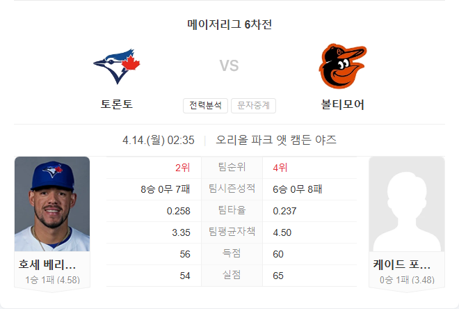 블루제이스는 최근 5경기에서 2승 3패를 기록하며 타선의 침묵이 이어지고 있습니다. 평균 득점은 3.3점으로 낮은 편이며, 시즌 총 6홈런에 그치고 있습니다. 그러나 조지 스프링어는 타율 .400과 10타점으로 팀의 중심을 잡고 있으며, 블라디미르 게레로 주니어와 보 비셋도 각각 .293, .313의 타율로 기여하고 있습니다. 선발 투수 호세 베리오스는 시즌 1승 1패, 평균자책점 4.58을 기록 중이며, 볼티모어를 상대로 통산 17경기에서 10승 2패, 평균자책점 3.31로 강한 모습을 보이고 있습니다.