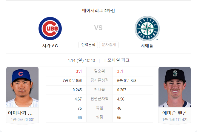 이번 경기는 투수의 흐름이 승부의 열쇠가 될 것입니다. 컵스의 이마나가는 초반 두 경기에서 인상적인 피칭을 보여주었고, 아직 실점하지 않은 상태입니다. 반면, 매리너스의 핸콕은 불안한 모습을 보이고 있어 이번 경기에서 큰 부담을 안고 던질 것으로 보입니다.