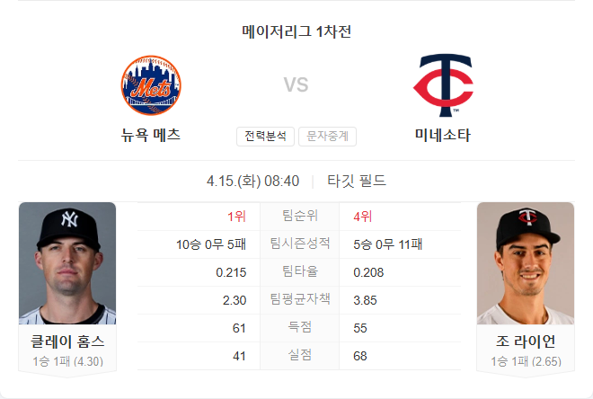 4월 15일 MLB 메이저리그 뉴욕 메츠 VS 미네소타 트윈스 타카짱의 경기 예측 분석