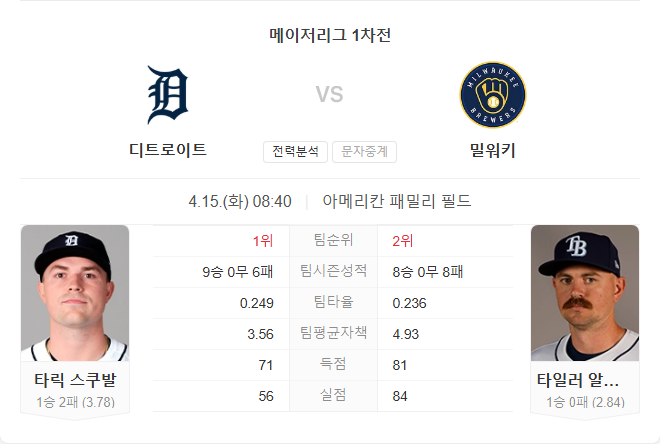 | 4월 15일 MLB 메이저리그 휴스턴 애스트로스 VS 세인트루이스 카디널스 타카짱의 경기 예측 분석 (0) | 2025.04.14 |