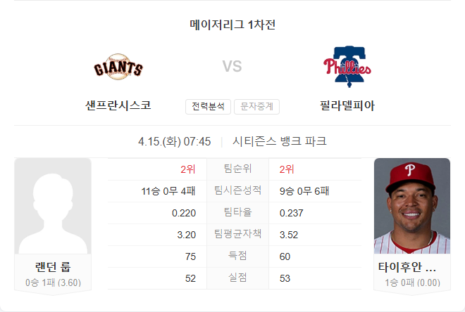 4월 15일 MLB 메이저리그 샌프란시스코 자이언츠 VS 필라델피아 필리스 타카짱의 경기 예측 분석