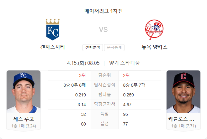 로열스는 루고의 안정적인 투구와 강한 양키스전 성적을 바탕으로 경기를 유리하게 이끌 수 있습니다. 반면, 양키스는 카라스코의 부진한 투구와 불안정한 불펜으로 인해 어려운 경기가 예상됩니다. 그러나 양키스는 강한 타선을 보유하고 있어, 경기 후반에 역전을 노릴 수 있습니다.