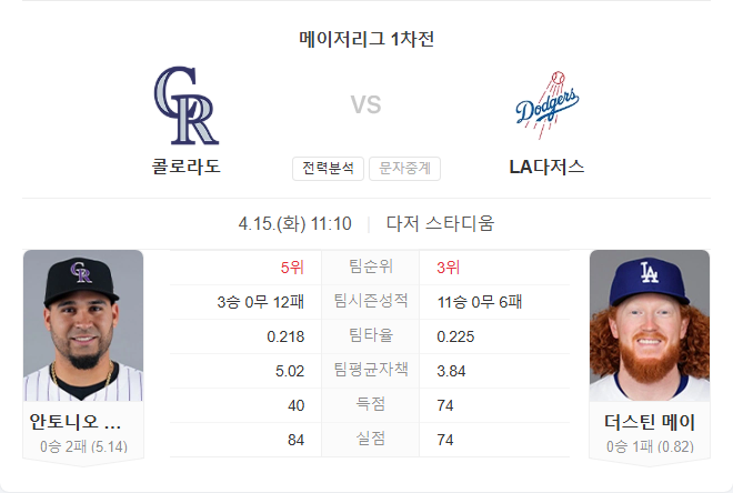 선발 더스틴 메이는 시즌 0승 1패, 평균자책점 0.82, WHIP 0.91, 7탈삼진을 기록 중이며, 안정적인 투구 내용을 이어가고 있습니다. 타선에서는 토미 에드먼이 6홈런, 테오스카 에르난데스가 최근 10경기에서 3홈런 8타점으로 중심 타선에서 활약하고 있습니다.