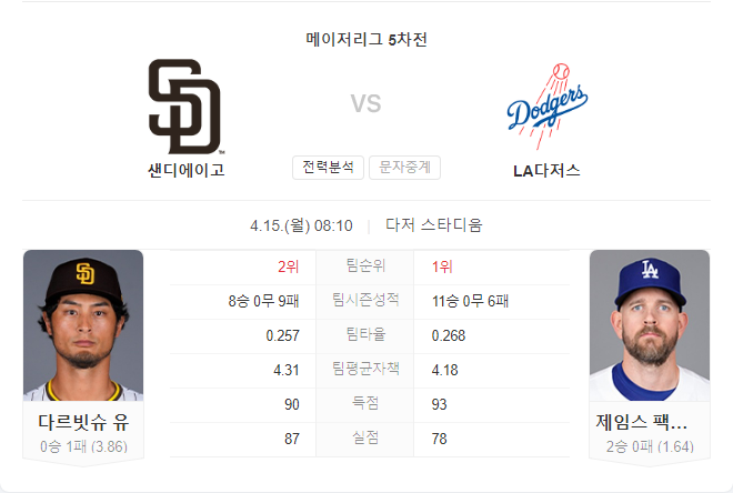 이번 경기는 두 베테랑 투수의 맞대결로, 팩스턴과 다르빗슈 모두 자신들의 구단을 대표하는 투수입니다. 다르빗슈가 시즌 초반 부진을 보이고 있는 반면, 팩스턴은 안정적인 투구를 이어가고 있어 다저스가 유리할 것으로 보입니다.