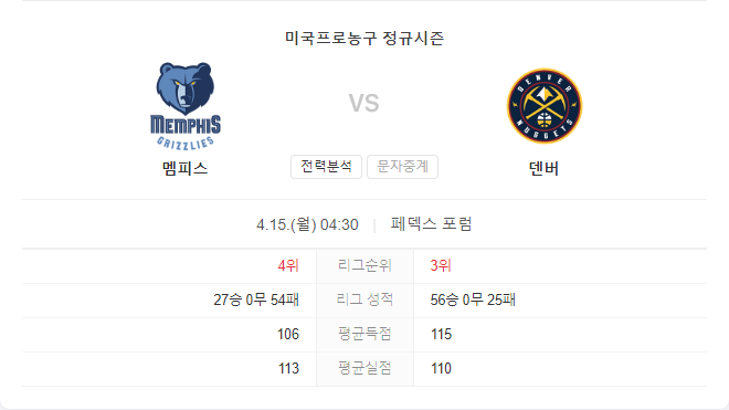 또한, 덴버는 이번 경기에서 승리해야만 서부 컨퍼런스에서 최상위 시드를 확보할 수 있는 만큼 높은 집중력을 보일 것으로 예상됩니다.