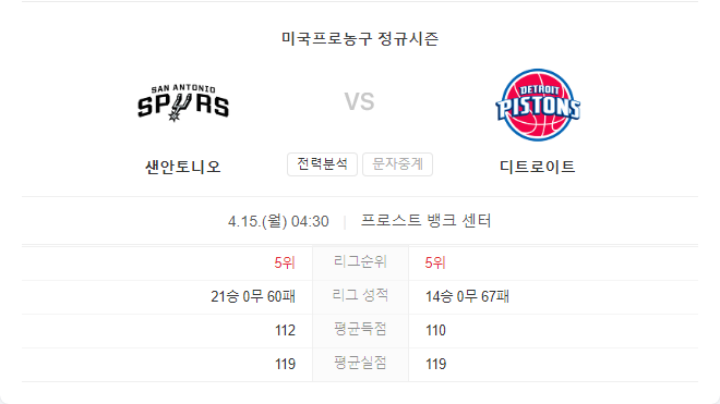 디트로이트 피스톤즈와 샌안토니오 스퍼스의 마지막 경기는 양 팀 모두에게 중요한 의미를 가지고 있습니다. 피스톤즈는 시즌 마지막 경기에서 승리를 추가하며 기분 좋게 시즌을 마치고 싶어 할 것이고, 스퍼스는 연승을 이어가며 시즌을 긍정적으로 마무리하고자 할 것입니다.