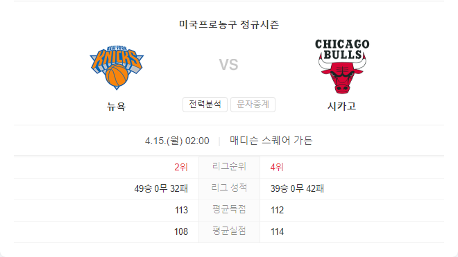 4월 15일 NBA 시카고 불스 VS 뉴욕 닉스 타카짱의 경기 예측 분석