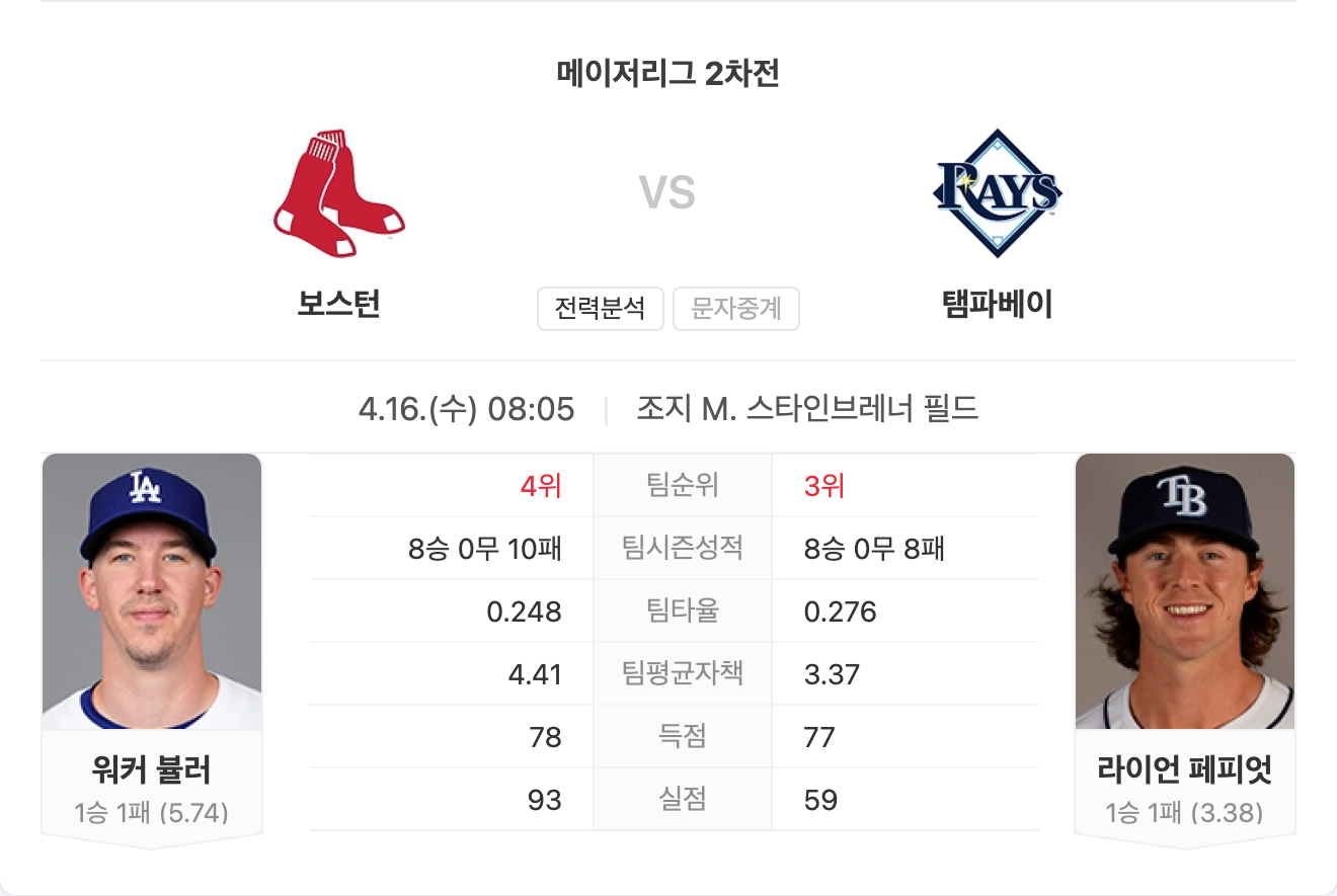 보스턴은 최근 타선의 부진을 겪고 있으나, 플로리다의 따뜻한 기후에서 반등을 기대하고 있습니다. 워커 뷸러는 지난 경기에서 호투를 펼치며 컨디션을 회복한 모습을 보였습니다. 반면, 탬파베이의 페피오트는 최근 경기에서 홈런을 다수 허용하며 장타에 대한 약점을 드러냈습니다. 이러한 점을 고려할 때, 보스턴이 근소한 우위를 점할 것으로 예상됩니다.