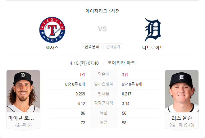 이번 경기는 두 팀 모두에게 중요한 시리즈의 첫 경기입니다. 텍사스는 로렌젠이 이번 시즌 첫 등판을 앞두고 있어, 그의 컨디션과 경기 운영이 팀 성적에 큰 영향을 미칠 것으로 예상됩니다. 반면 디트로이트는 홈에서 좋은 모습을 보여주고 있는 올슨에게 기대를 걸고 있습니다.