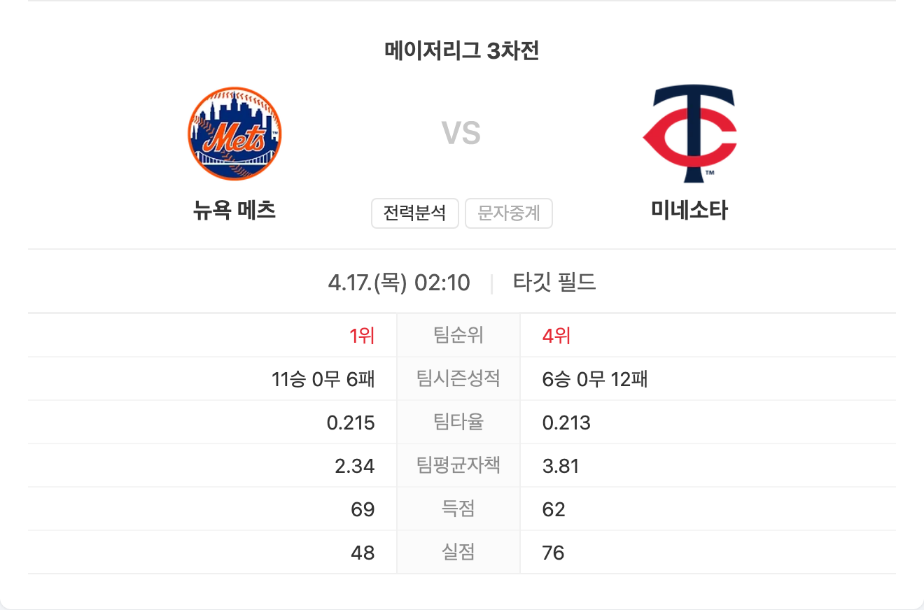 4월 17일 MLB 메이저리그 뉴욕 메츠 VS 미네소타 트윈스 타카짱의 경기 예측 분석