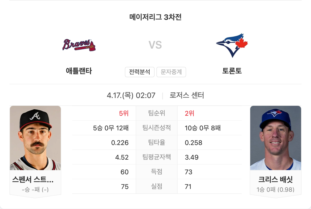 애틀랜타는 스트라이더의 복귀와 함께 반등을 노리고 있으나, 전체적인 타선의 부진과 원정 경기에서의 약세가 우려됩니다. 반면, 토론토는 배싯의 안정적인 투구와 홈 경기의 이점을 바탕으로 승리를 기대하고 있습니다. 양 팀 모두 부상자가 많아 전력 누수가 있지만, 토론토가 근소한 우위를 점할 것으로 예상됩니다.