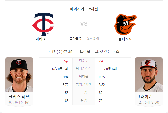 이번 경기에서 크리스 페덱이 선발로 나서며, 그는 올 시즌 아직 승리가 없지만, 평균자책점 4.15를 기록하며 안정적인 투구를 보여주고 있습니다. 특히 볼티모어 오리올스를 상대로 과거 2승 무패, 평균자책점 1.69를 기록한 바 있어 이번 경기에서도 좋은 모습을 기대하고 있습니다.