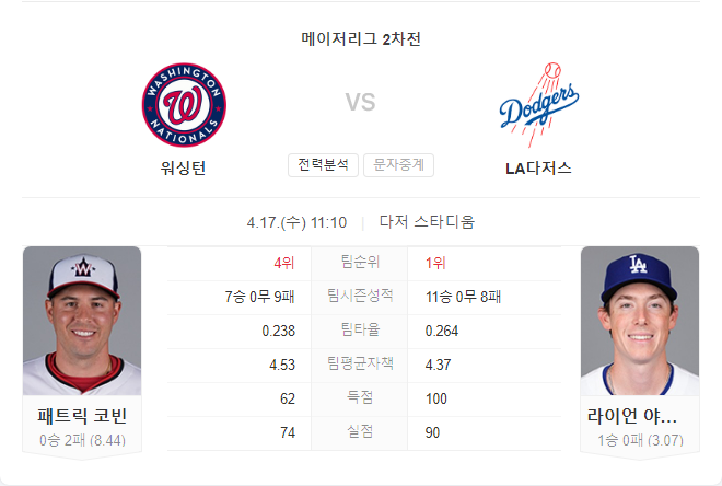 타오스카 에르난데스는 17타점으로 팀 내 최다 타점을 기록하고 있습니다. 투수진 또한 상대 타자들의 타율을 .223으로 제한하며 리그 4위에 올라있는 중입니다. 이번 경기에서 다저스는 계속된 좋은 기세를 이어가려 합니다.