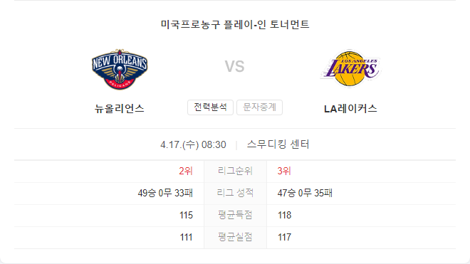 4월 17일 NBA LA 레이커스 VS 뉴올리언스 펠리컨즈 타카짱의 경기 예측 분석