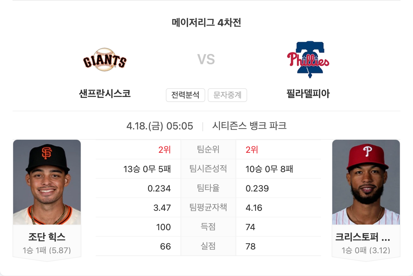 반면 필리스는 상위 타순에서의 득점력은 유지되고 있으나, 하위 타순의 침묵과 불펜의 기복이 부담으로 작용할 수 있습니다. 경기 후반으로 갈수록 자이언츠가 조금 더 유리할 전망입니다.