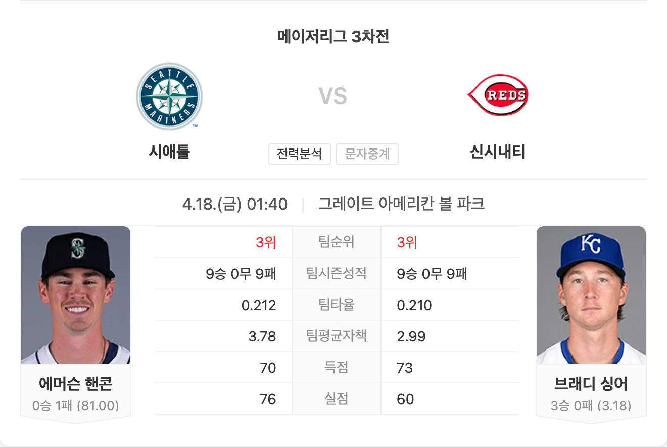 시애틀은 브라이언 우의 안정적인 투구와 최근 타선의 활약을 바탕으로 원정 첫 승리를 노리고 있습니다. 반면, 신시내티는 홈에서의 강세와 브래디 싱어의 호투를 기대하고 있습니다. 그러나 싱어는 시애틀을 상대로 다소 부진한 기록을 가지고 있어 우려되는 부분입니다. 전체적으로 투수전 양상이 예상되며, 시애틀이 근소한 차이로 승리를 거둘 가능성이 높습니다.