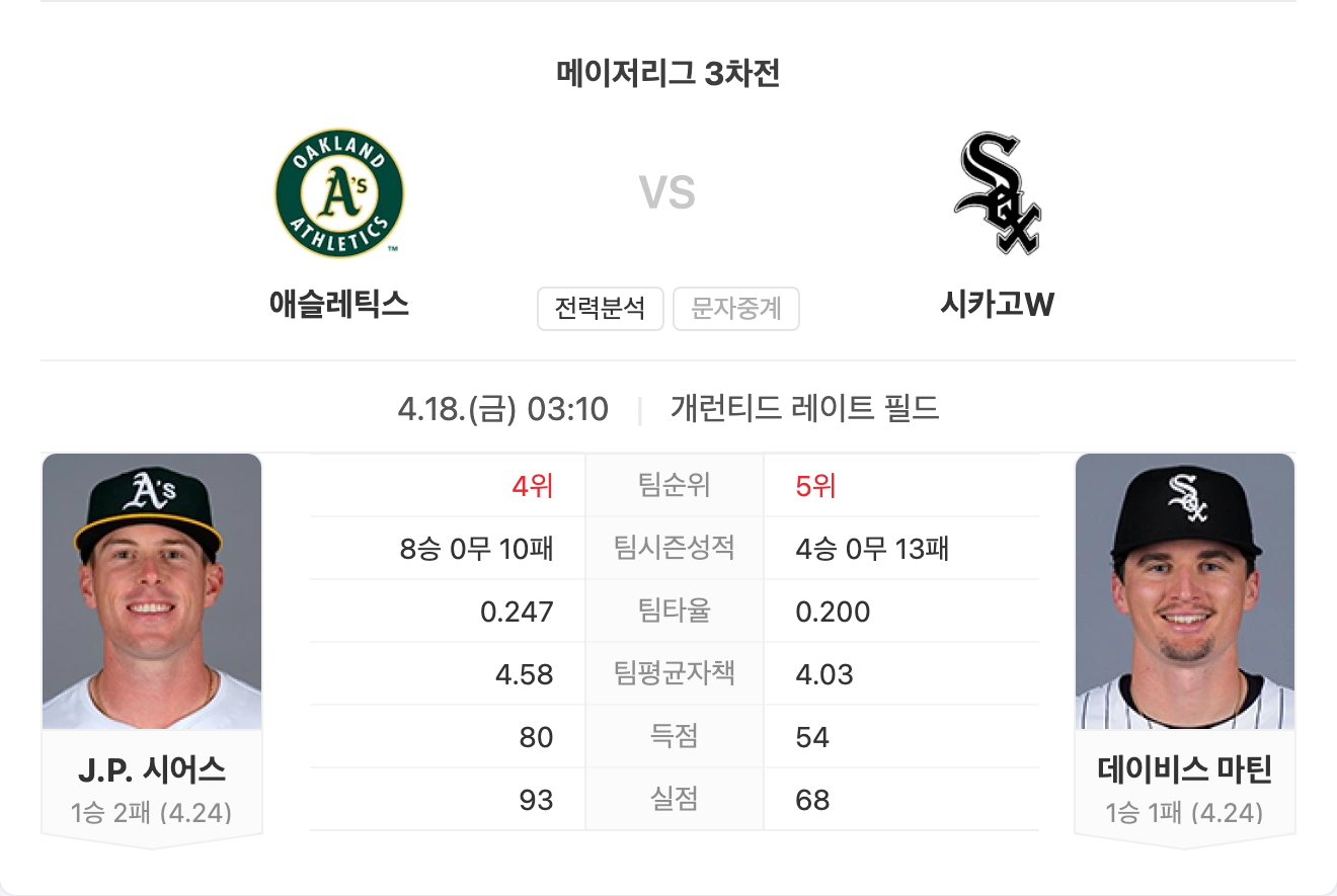4월 18일 MLB 메이저리그 애슬레틱스 VS 시카고 화이트삭스 타카짱의 경기 예측 분석