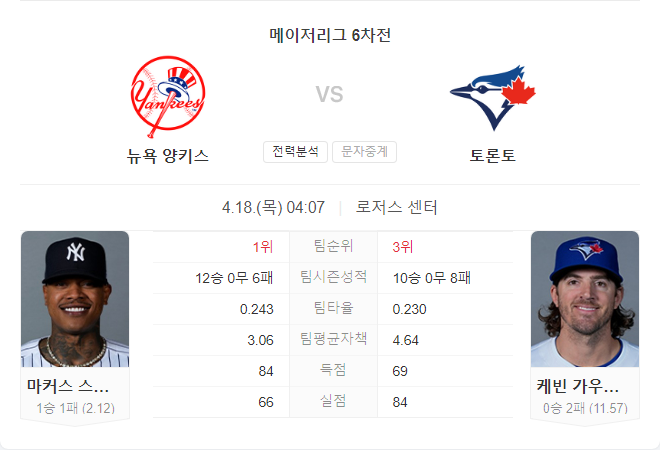 양키스의 탄탄한 투수진과 토론토의 불안정한 투수진을 고려할 때, 이번 경기는 양키스가 유리한 위치에 있다고 볼 수 있습니다. 또한 양키스는 최근 원정 경기에서 강한 모습을 보여주고 있어, 이번 경기에서도 좋은 성적을 기대할 수 있을 것입니다. 반면 토론토는 가우스먼의 부진을 극복하고 타선에서 활발한 득점을 해내야만 승산이 있을 것으로 보입니다.