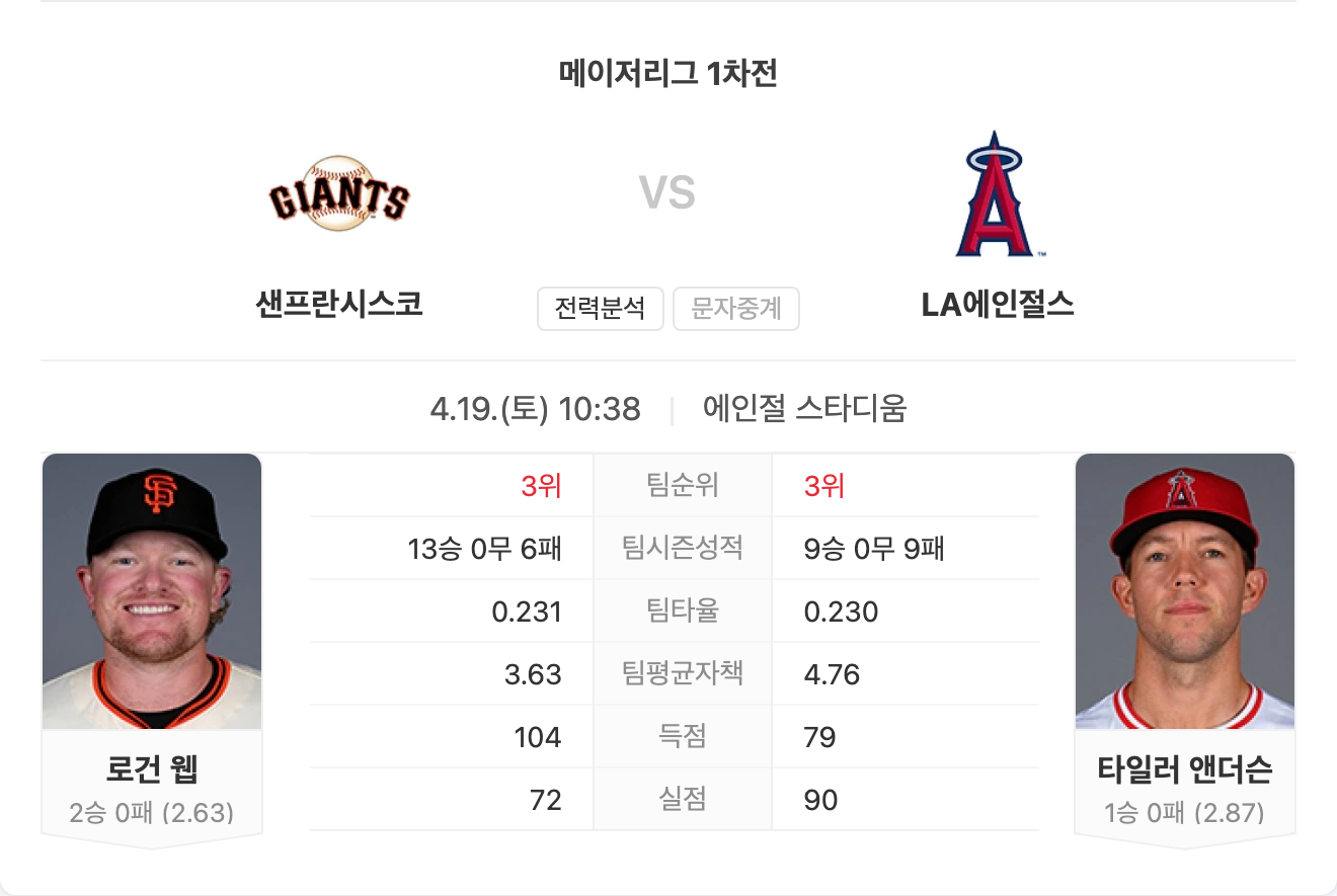 에인절스는 최근 5경기에서 3승 2패를 기록하며 자이언츠와 비슷한 흐름을 보이고 있습니다. 이 기간 평균 득점은 4.4점, 실점은 4.2점으로 경기마다 접전 양상이 많았습니다.
