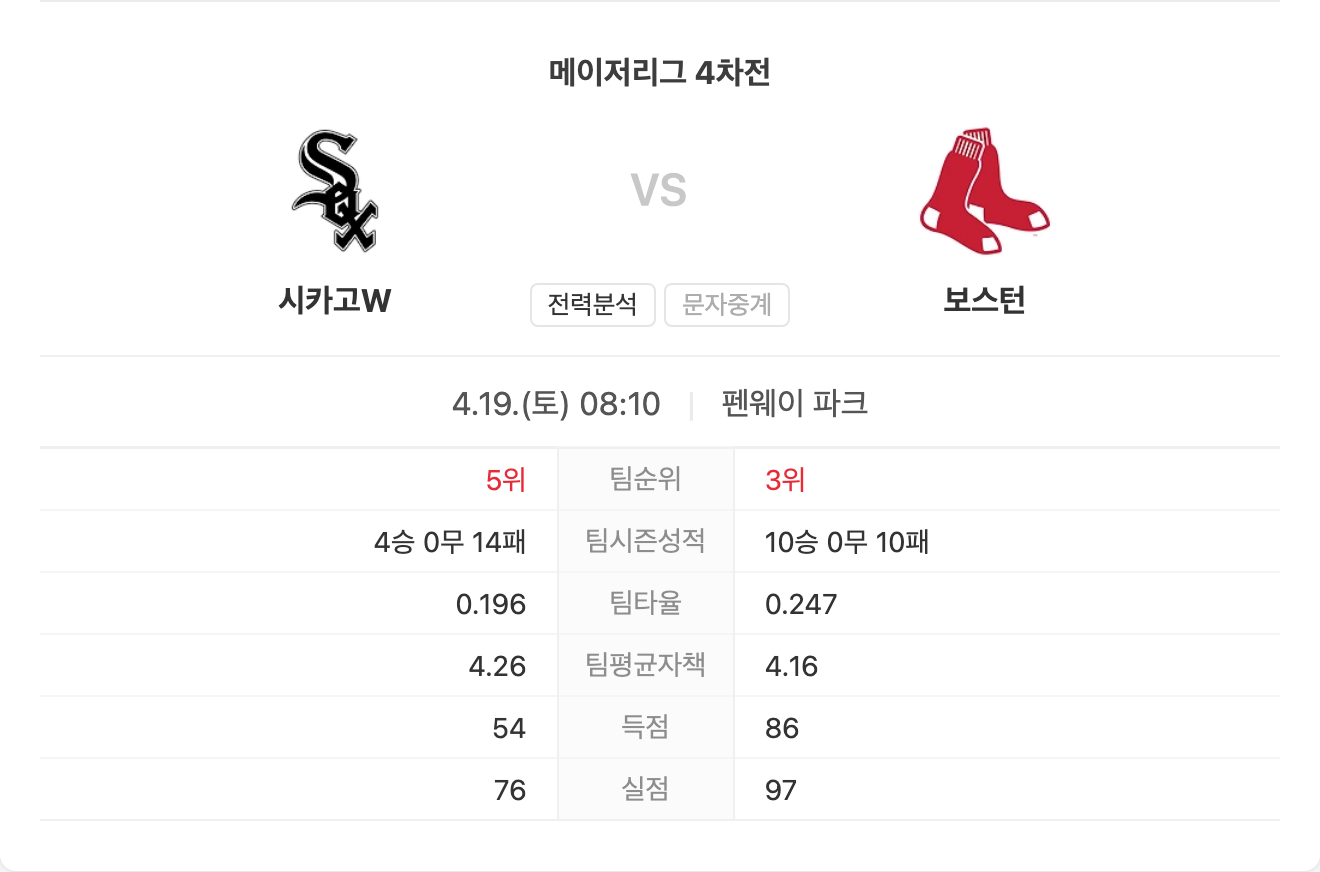 반면 레드삭스는 홈에서 안정적인 투수 운용과 상위 타선의 활약을 기반으로 꾸준히 승리를 챙기고 있으며, 전체적인 전력과 최근 흐름 모두에서 우위를 점하고 있습니다.