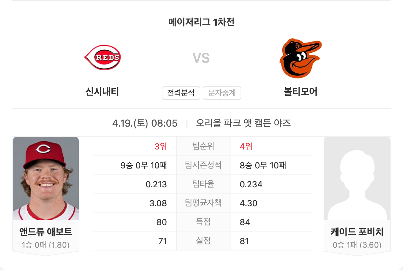 4월 19일 MLB 메이저리그 신시내티 레즈 VS 볼티모어 오리올스 타카짱의 경기 예측 분석