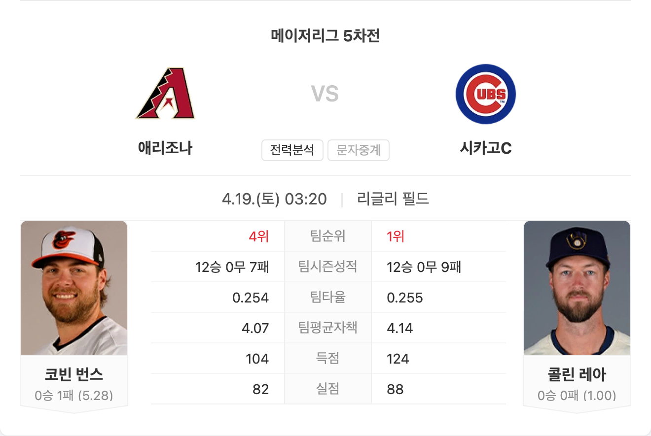 반면 컵스는 타선이 꾸준한 득점 생산을 이어가고 있으며, 마운드와 불펜에서 안정적인 투구 내용으로 흐름을 잘 유지하고 있습니다. 최근 경기력만 놓고 본다면 컵스가 좀 더 우세한 위치에 있습니다.