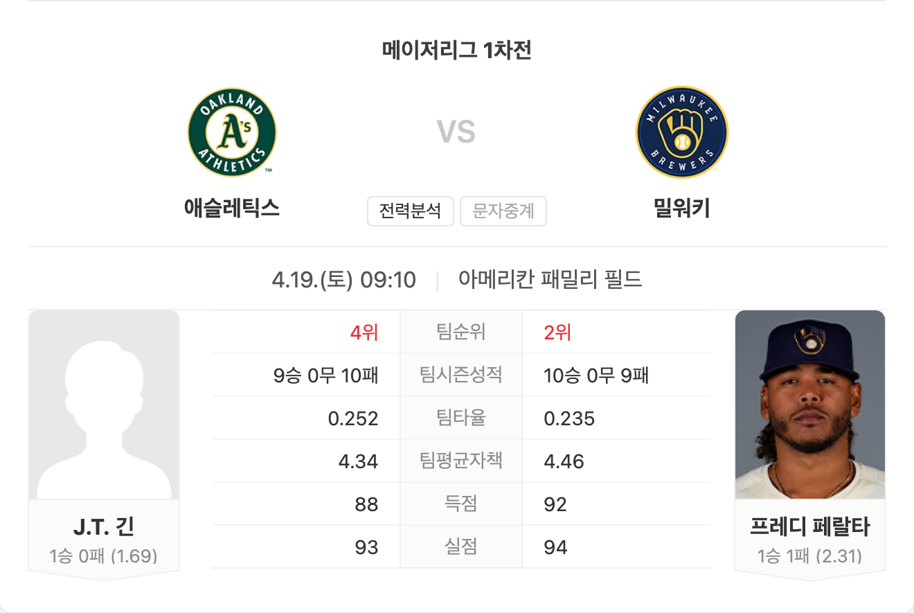 4월 19일 MLB 메이저리그 에슬레틱스 VS 밀워키 브루어스 타카짱의 경기 예측 분석