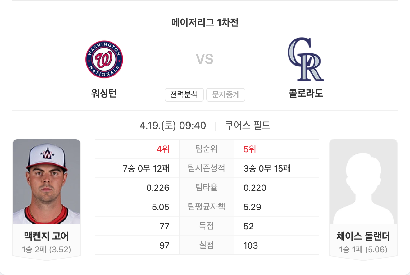 반면 로키스는 타선은 평균 이상이지만, 마운드에서 지나치게 많은 실점을 허용하고 있으며, 불펜의 기복이 승부처에서 약점으로 작용하고 있습니다. 전반적인 흐름에서 내셔널스가 우위를 점할 가능성이 높습니다.